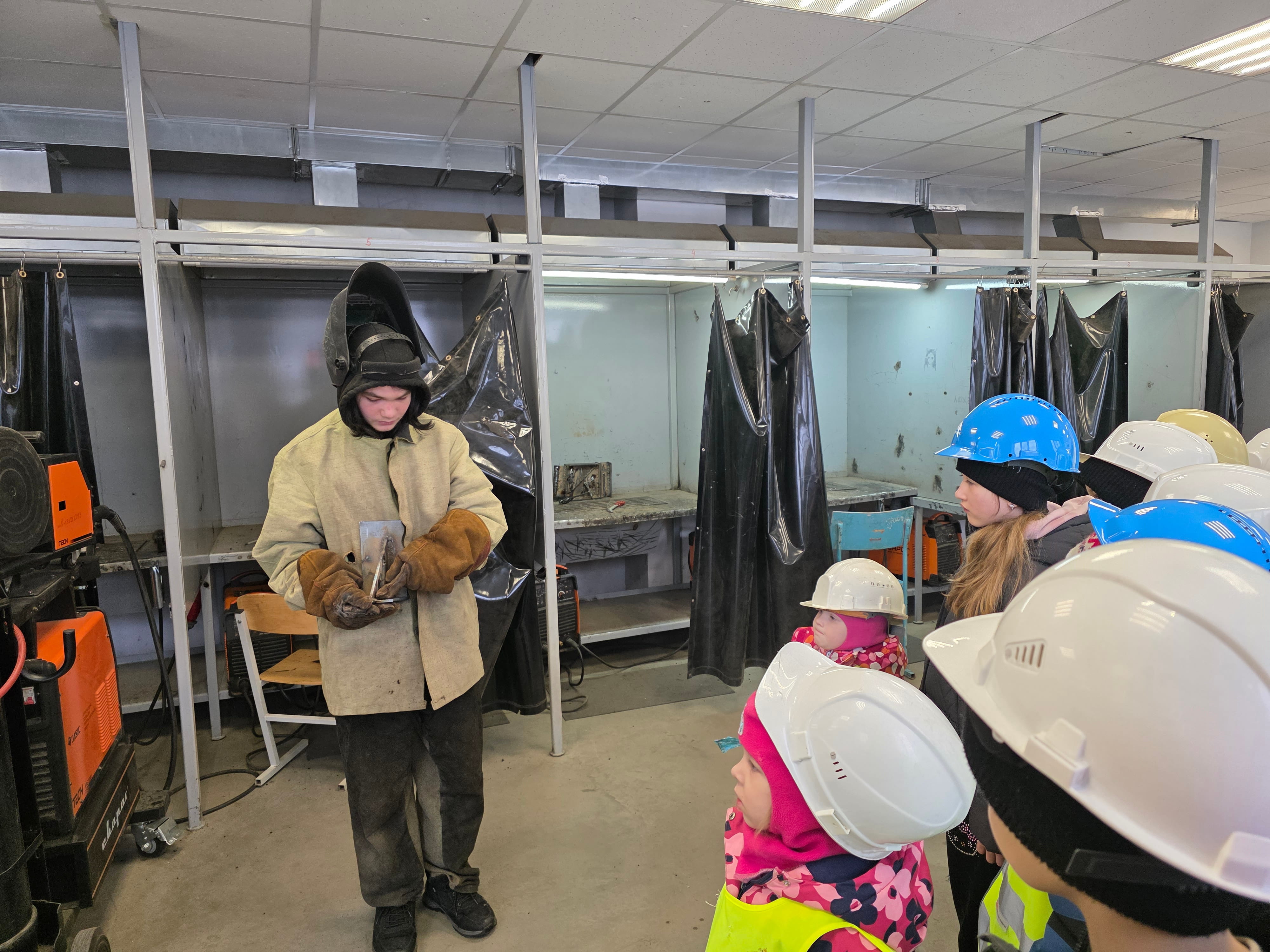 В рамках экскурсии, студенты провели для воспитанников детского сада мастер - класс по исполнению таврового соединения металлических пластин. Соблюдая все правила техники безопасности, будущие сварщики проварили швы, а малыши с нетерпением ждали результата. Когда шторка кабинки распахнулась, ребята увидели, что пластины соединены между собой крепким швом и теперь остается только его зачистить и предъявить наставнику для оценки труда.